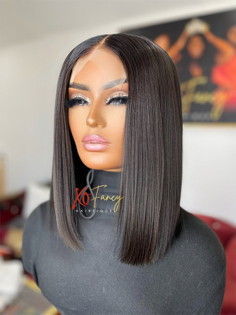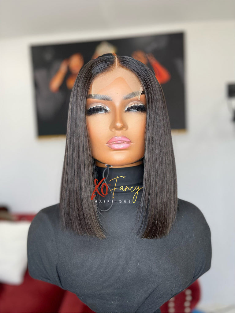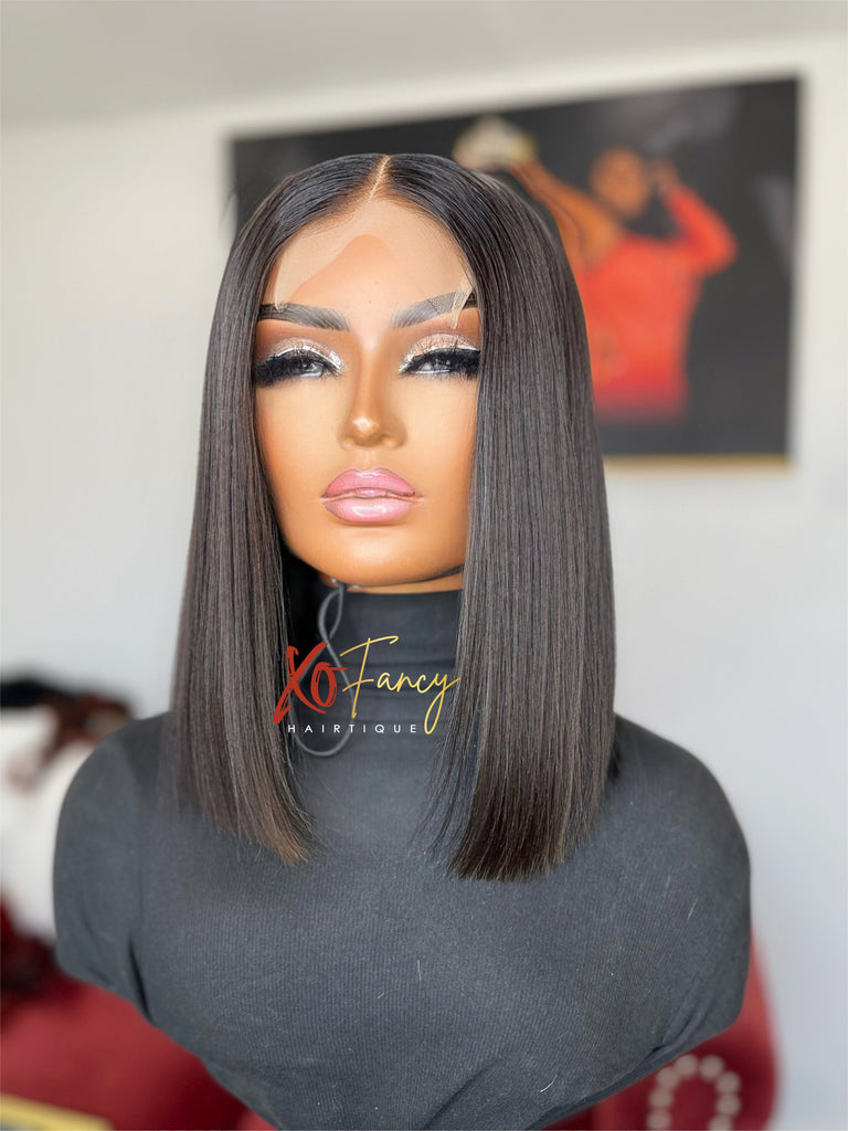 Frenchie unit is Premade 180 density constructed using 14 inch Virgin extensions and 4x4 transparent closure. Premade wigs fit head size Small, Medium, Large